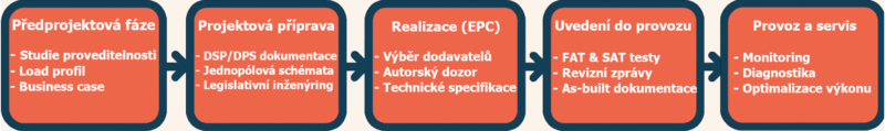 - Legislativní inženýring – jednání s distributorem (EG.D, PRE, ČEZ), žádosti o připojení, povolení stavebního úřadu, EIA (u větších zdrojů), požární a bezpečnostní posudky.